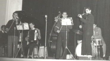 GS Lisesi Tevfik Fikret Salonu'ndaki Konserlerimizde Çigan müziği orkestramız: Kemanlarda genellikle Ahmet Yürür, Vedat Evren, Doğan Babacan, Aydın Köksal, Akordeonda Bener Akbaş, Piyanoda Oğuz Evrenos ya da Timur Selçuk... - 5 Nisan 1959