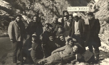 GS Gezi Kolu Baskanı Aydın Köksal (sol başta), bir Fransız öğretmenin kamerasından, onun eşi, iki çocuğu ve coğrafya öğrtemenimiz Ferruhzat Turaç ile (ortada), bir yurt gezisinde Gülek Boğazı'nda, Şubat 1959.