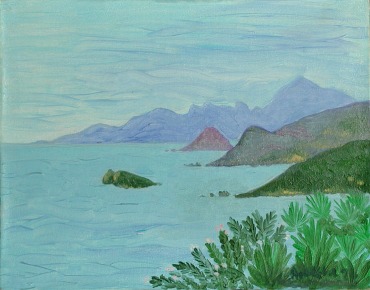 Sevgi Yağan O Güzel Ülke, 1993, tuval üzerine yağlıboya, 70 x 90 cm. (Evet’in çınladığı o güzel ülke, Dante; Karakuş Dağları’ndan Yunus’a saygı